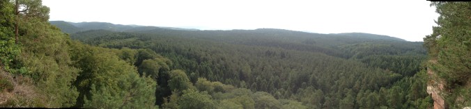 Von hier aus schlängelte sich der Weg zurück Richtung Burg. Ein kleiner Abstecher an einer Kreuzung führte zum Aussichtspunkt Geyersley. Von hier aus waren es ca. 400m bis man am Aussichtspunkt war. Der Aussichtspunkt wies über das Tal und man konnte die Burg Ramstein schön sehen.