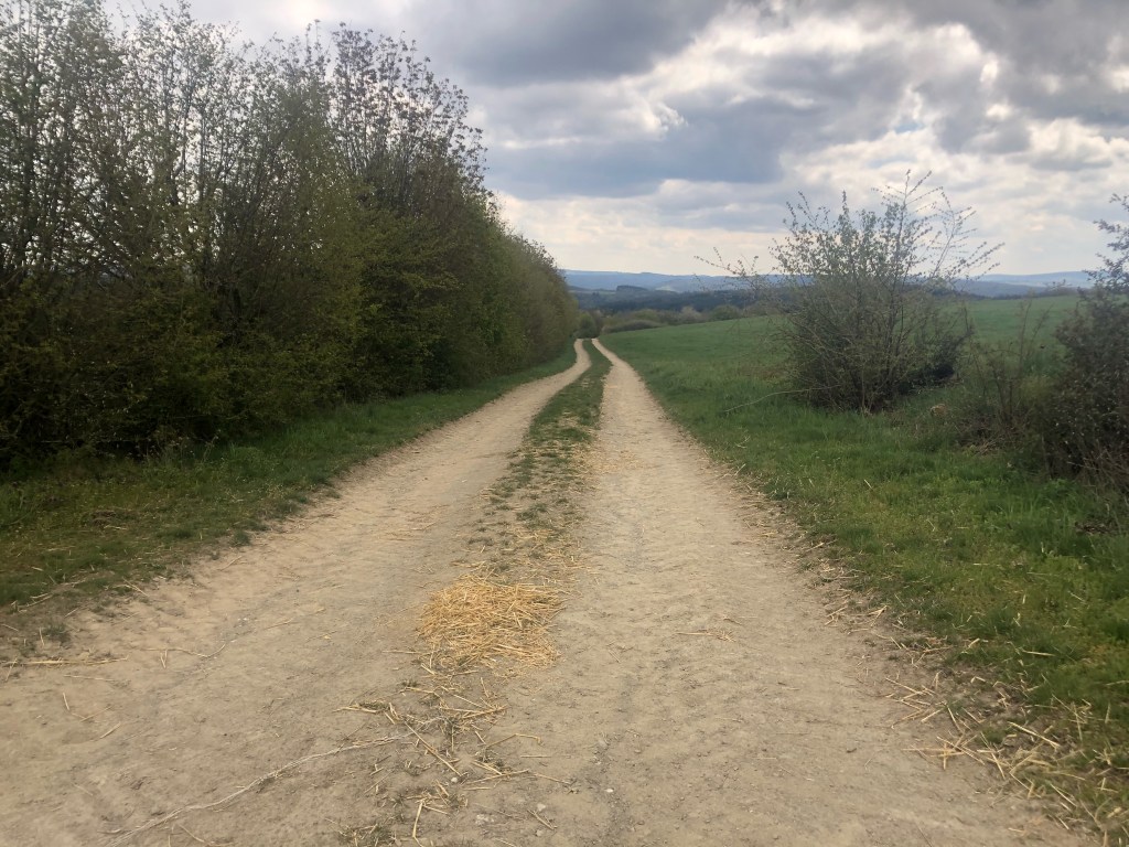 Parken kann man auf dem Wanderparkplatz direkt am Sportplatz, hier befindet sich der Ausgangspunkt für die Wanderung, man geht erst vom Parkplatz bergauf auf einem Feldweg im Uhrzeigersinn. Ich bin fit und guter Dinge, komme schnell und gut in meinen Tritt. Das Wetter ist wechselhaft aber trocken. Mal sehen ob ich meine Regensachen brauche. An einem Heuschober geht es rechts ab ins Tal, von hier hat man einen wunderbaren Blick auf Wollmerschied, ein niedliches kleines Dorf im Taunus.