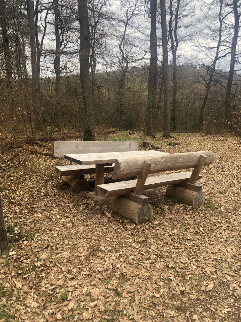 Hier in diesem Laubwald ist absolute Stille, kein Mensch, weil dieser Rundweg sicherlich einer der Abgelegesten zu sein scheint. Das Wetter ist kühl angenehm zum wandern, es ist trocken und dadurch ist der Untergrund auch trocken. Es ist schon etwas kühler als gestern, da heute keine Sonne scheint dadurch hab ich mich entschieden eine zusätzliche Jacke mit zu nehmen. Wenig später komme ich an eine Kreuzung, nagut besser einen Wegweiser, hier steht eine wunderbare Bank mit Tisch, die dazu einläd Pause zu machen.