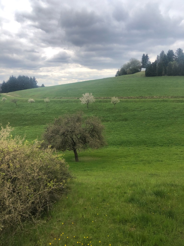 Der Weg schlängelt sich angenehm nach oben, ich komme durch saftig grüne Wiesen. Wer wie hier wohnt hat tatsächlich absolute Ruhe. So langsam werde ich auch warm, bekomme meine Betriebstemperatur und gehe zügig bergauf Richtung Dorf. Der Höhenweg schlängelt sich nun unterhalb des Dorfes auf gleichbleibender Höhe entlang.