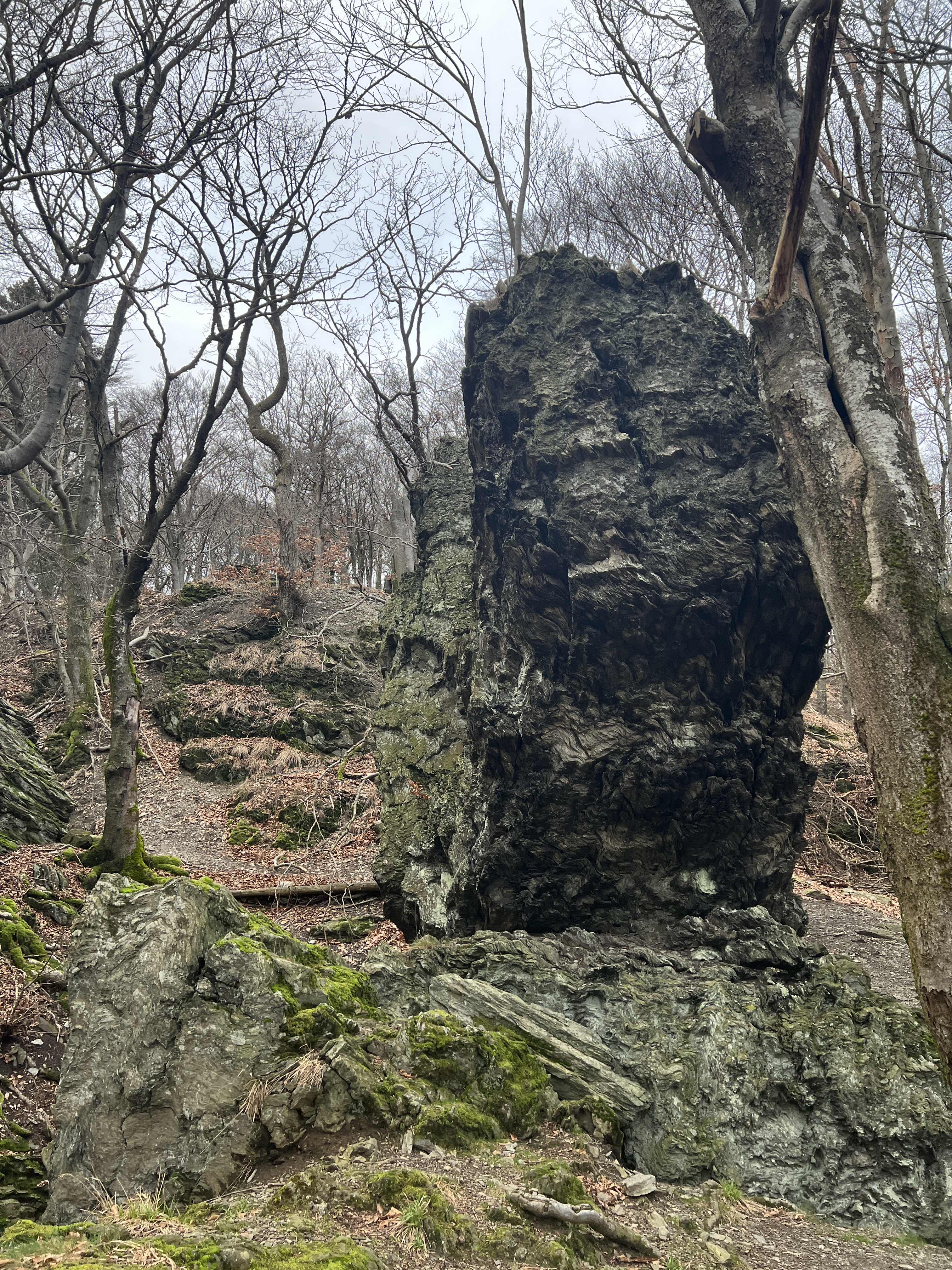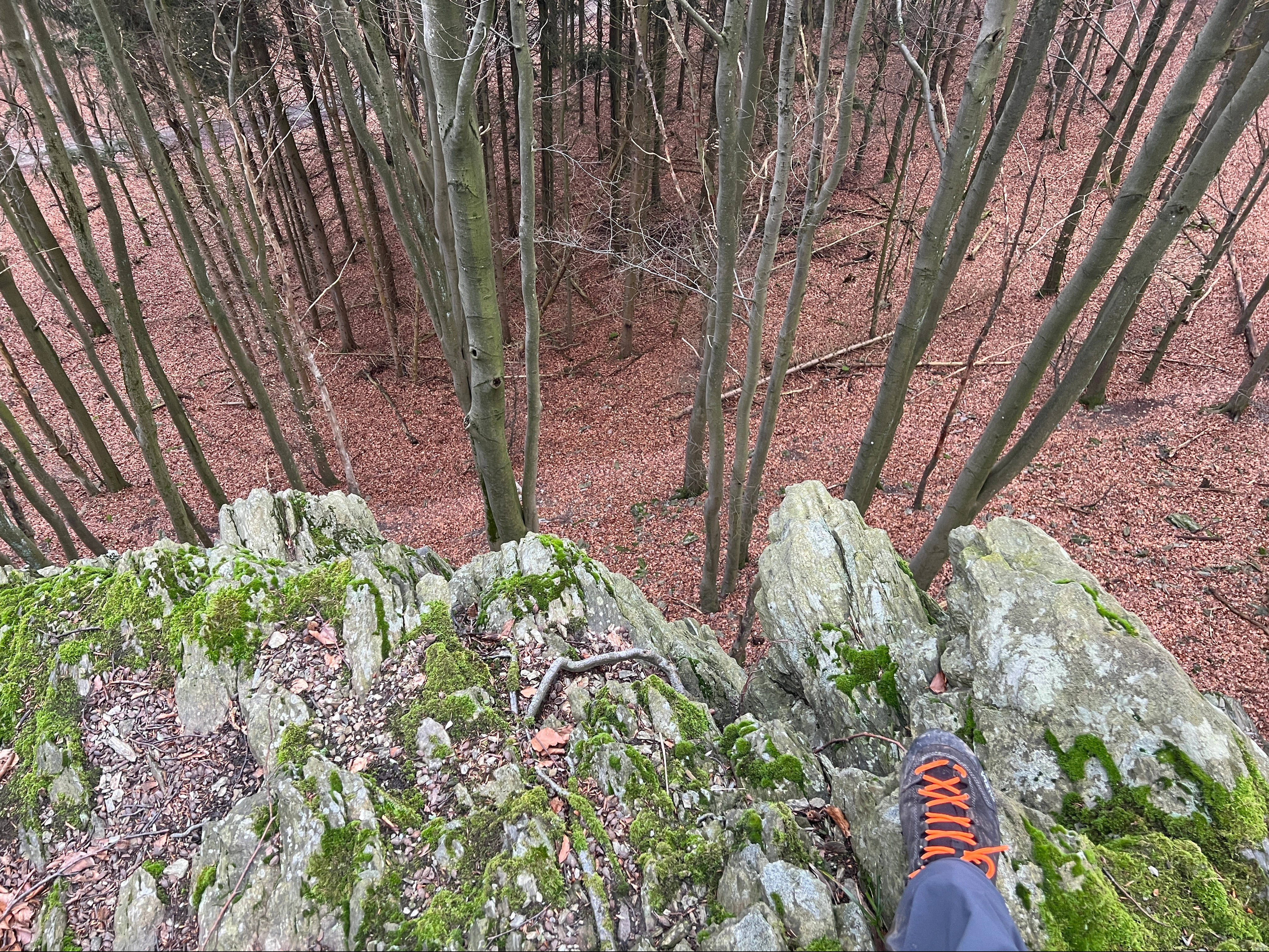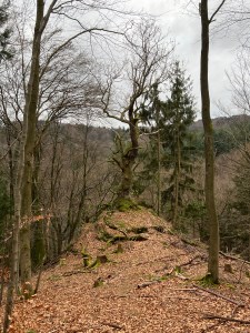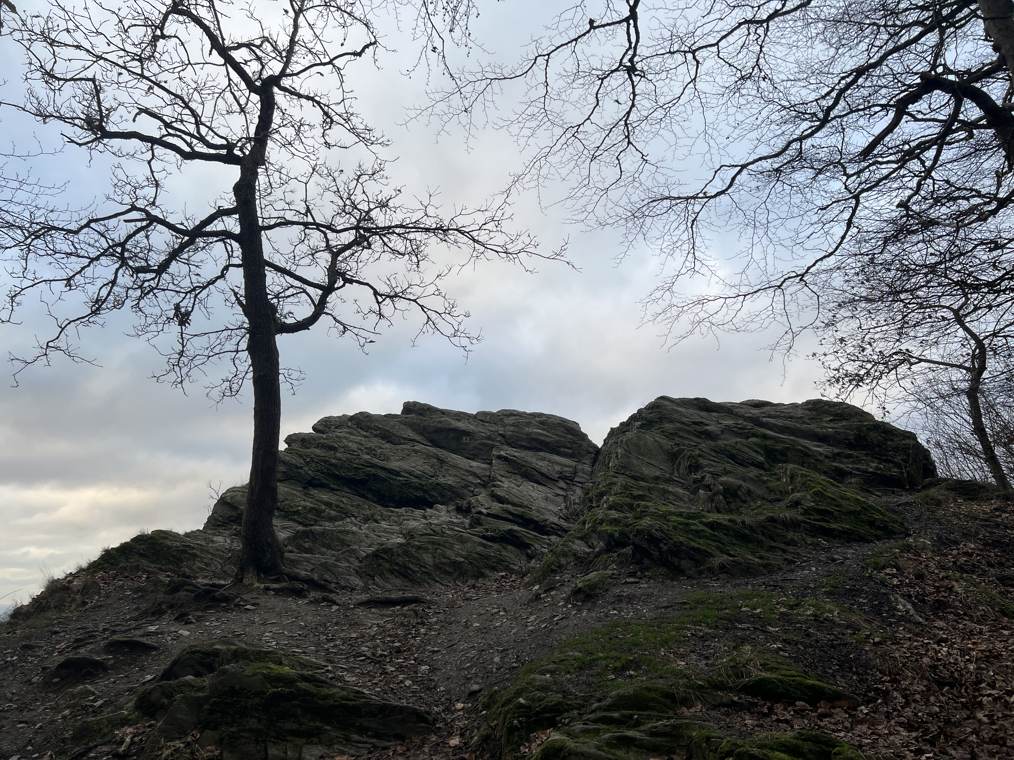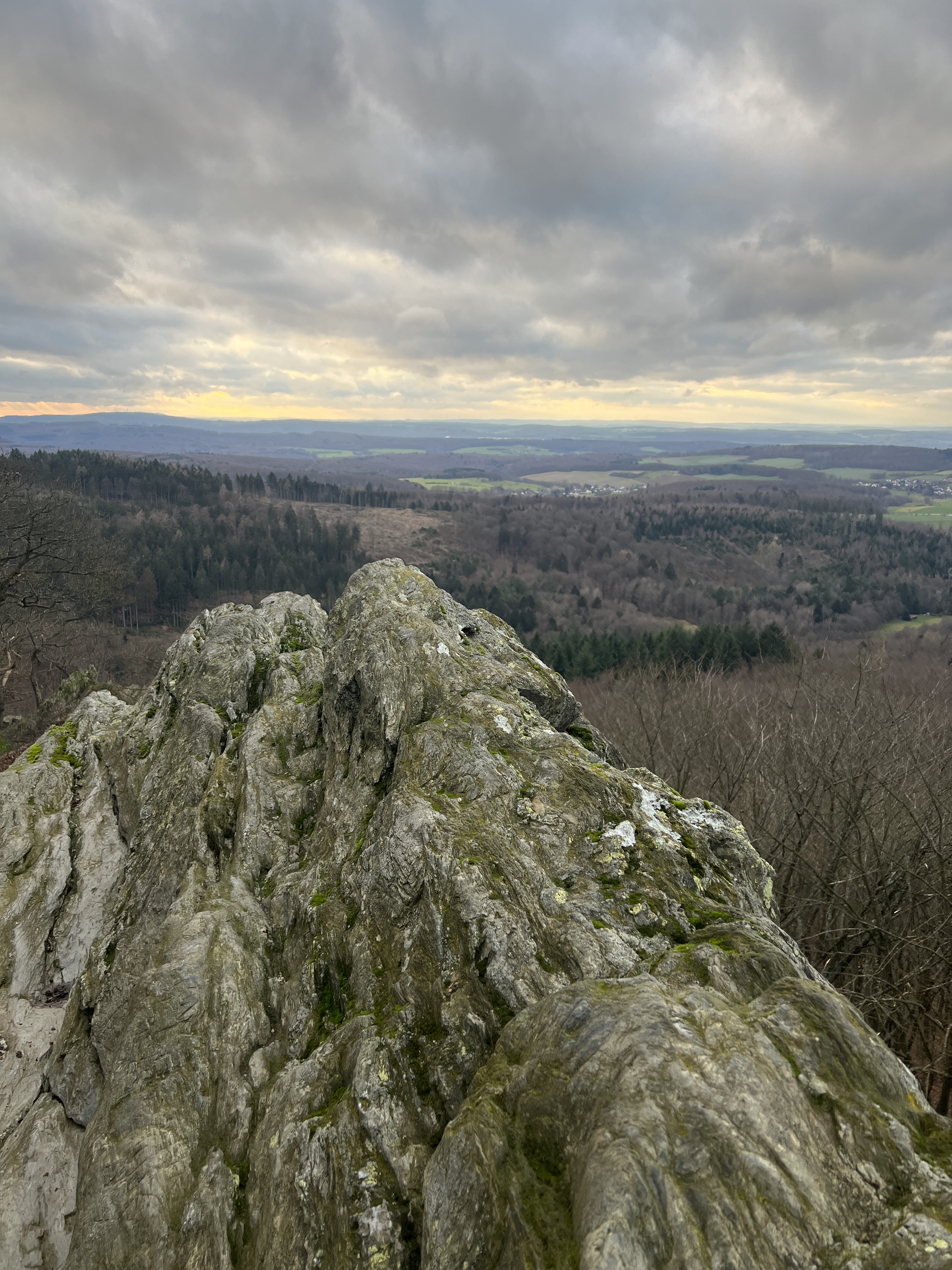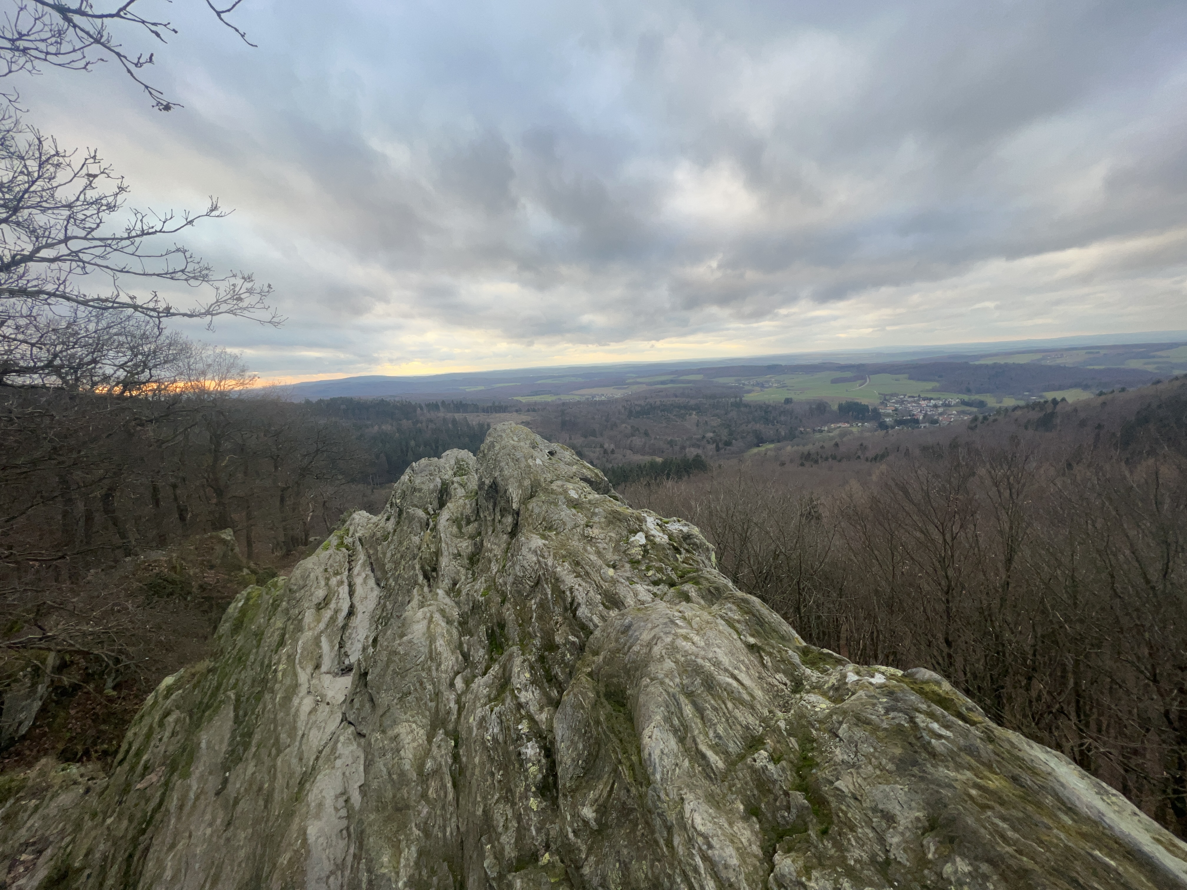Wenig später komme ich dann auch am grossen Zacken vorbei, es geht für mich wieder steil nach oben – krass die Felsen hier mitten im Wald. Toll!! Von oben habe ich einen genialen Ausblick in den Taunus. Zwar ist heute das Wetter etwas bedeckt, aber der Blick ist schon klasse.