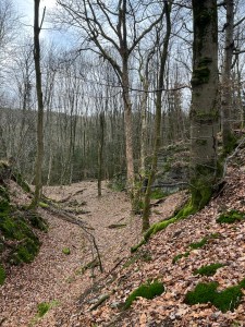 Wenig später treffe ich auf die Burgruine Hattstein und laufe unterhalb der Ruine Richtung Westen auf einen kleinen Pfad, der oberhalb der Bundesstraße verläuft. Der Pfad ist nicht gut erkennbar, es liegt sehr viel Laub, immer wieder trampel ich durch aufgewühlten Boden, der durch Wildschweine verursacht wurde, aber mein Instinkt und meine Navigation sagen mir, dass ich auf dem richtigen Weg bin.