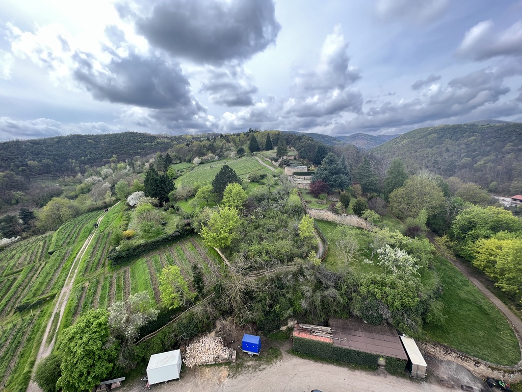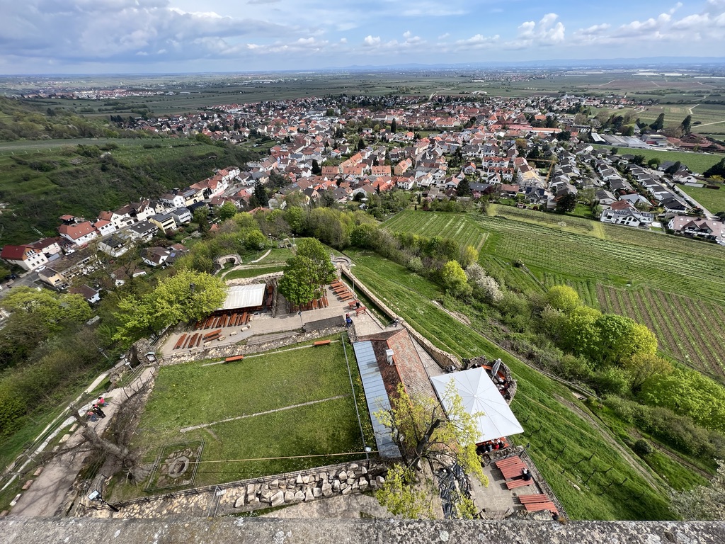 In den Weinbergen gehe ich Richtung Deidesheim. Mein Weg führt mich zuerst auf die Wachtenburg. Hier oben gibt es Gastronomie und eine öffentliche Toilette. Für jene, die hier einkehren wollen, gibt es ein schönes Restaurant mit einem tollen Ausblick. Die Tische sehen sehr gemütlich aus und es riecht lecker nach Rotkohl. Mir läuft zwar das Wasser im Munde zusammen, aber ich habe noch ein paar Meter vor mir und daher gehe ich schnurstracks auf den Turm hinauf. Für ein paar Hintergründe zur Wachtenburg – einfach hier klicken