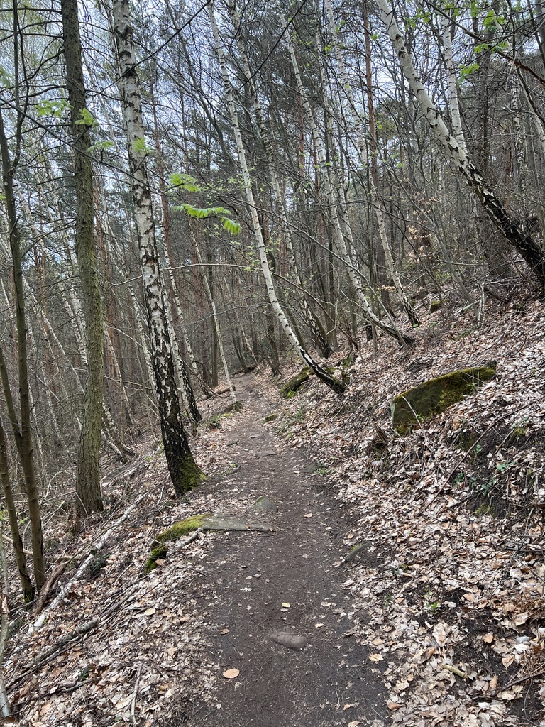 Ich biege dann rechts ab auf dem Wanderweg Nummer 5, der mit blau-weißen Streifen gekennzeichnet ist. Es geht erst mal in Serpentinen bergab, bis zu einem Pfad, der auf dem Höhenzug eine ganze Weile lang am Berg entlang verläuft.