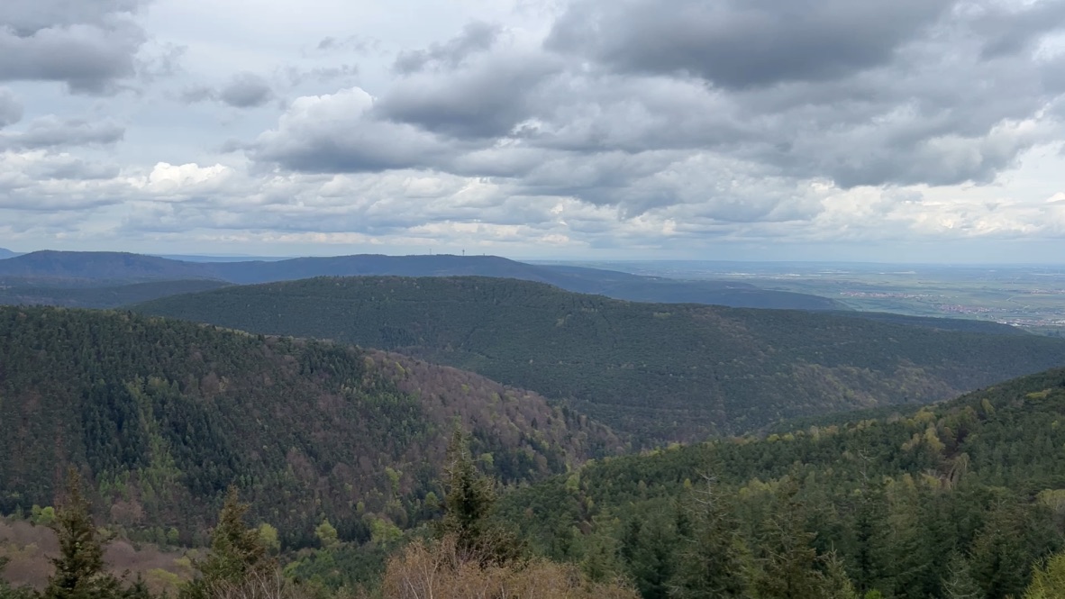 Hinter dem Turm geht ein kleiner Steig über eine kleine Treppe hinauf, bis ich auf einen Forstweg stoße, den ich bergauf nehme. Auch von hier hat man einen traumhaften Blick über die Ebene bis rüber auf die andere Rheinseite. Es geht kontinuierlich bergauf, bis auf der rechten Seite eine Waldhütte erscheint, danach führt der Weg einmal rechts und dann links weiter zum Eckkopfturm. Auf einem kleinen Waldpfad stopfe ich weiter Berg auf. Hier oben bin ich schon ganz schön außer Atem, denn bis auf meinen Urlaub auf der portugiesischen Insel Madeira, habe ich keine Wanderung mehr unternommen. In Deutschland war das Wetter leider viel zu schlecht und ich hatte immer andere Dinge zu erledigen.