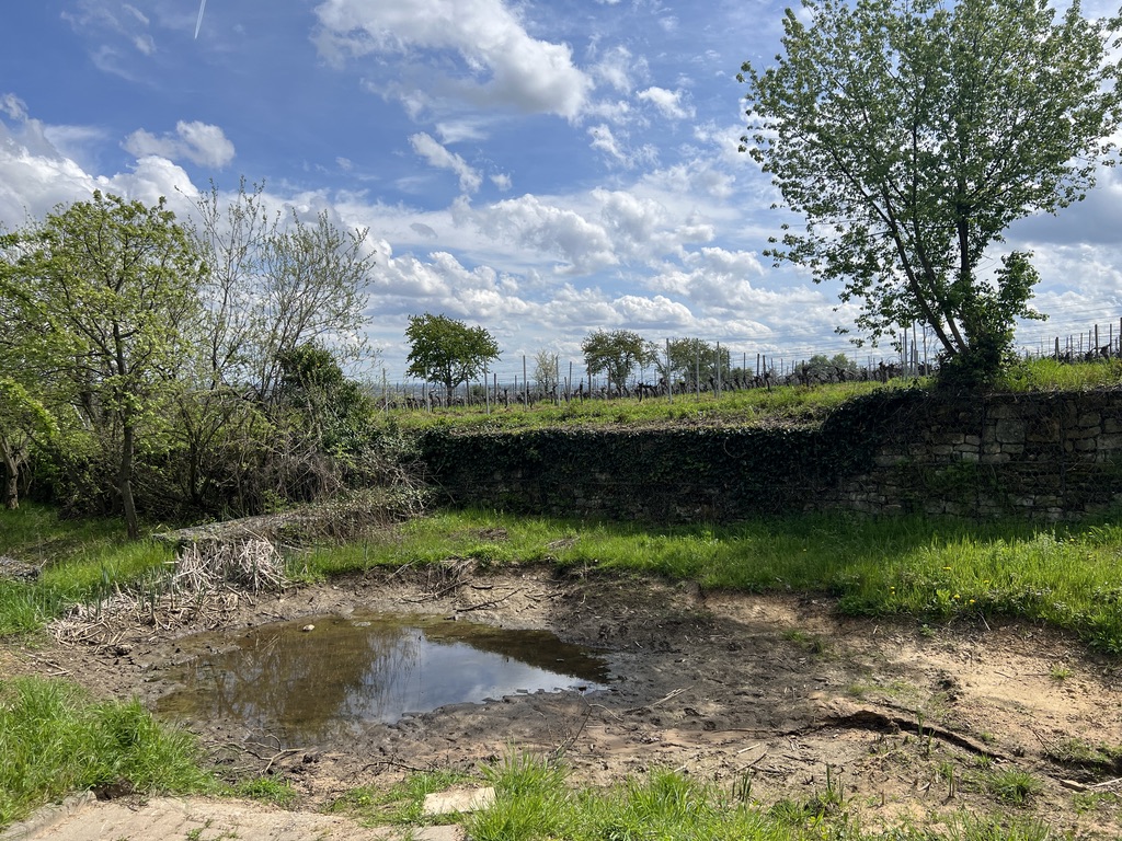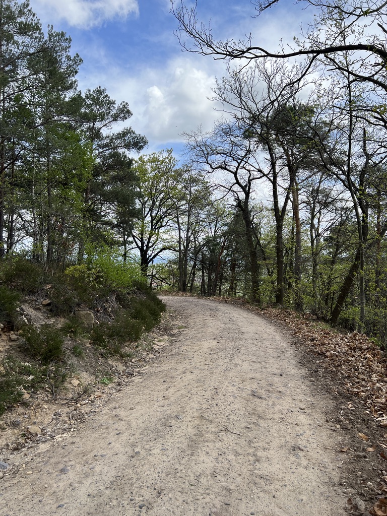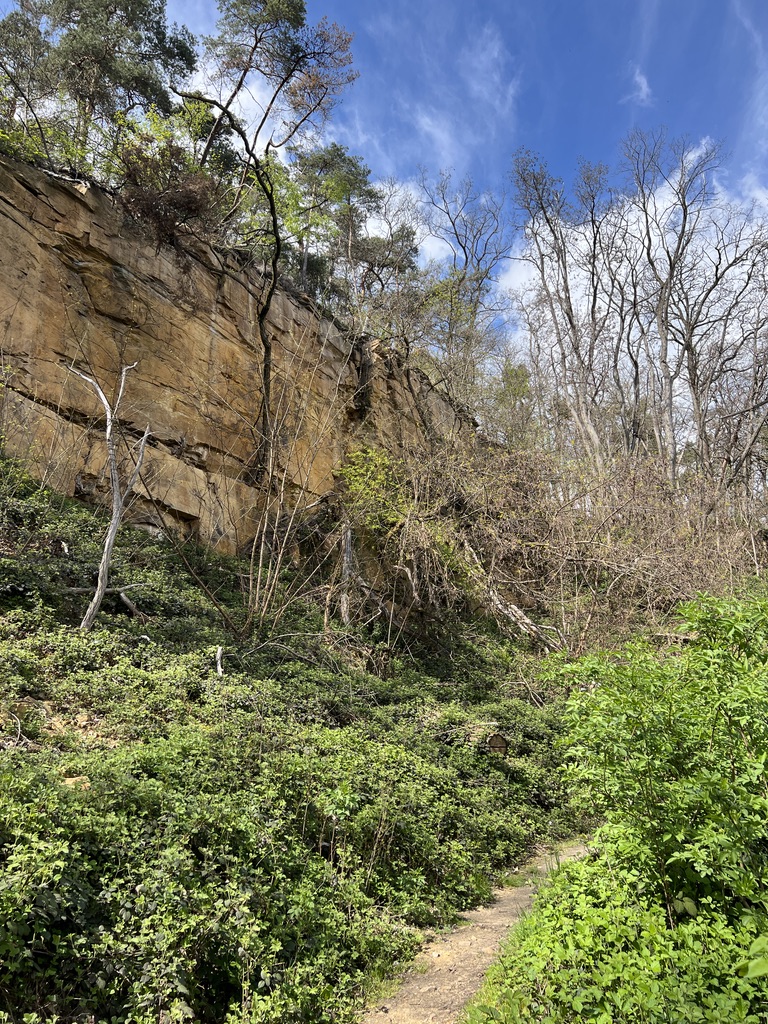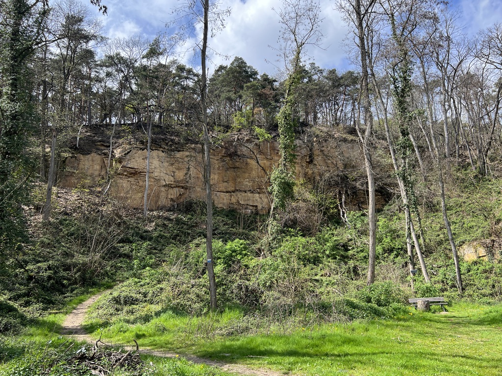 Ab hier geht es in einem Bogen an der Rheinebene entlang. Die Vegetation erinnert mich an Frankreich, es riecht ein wenig nach Pinien – oder bilde ich mir das nur ein – ich weiss es nicht, denn schon geht der Weg an einem Steinbruch hoch in den Wald hinein, um wenig später wieder auf den vorherigen Weg hinunter zu gehen.