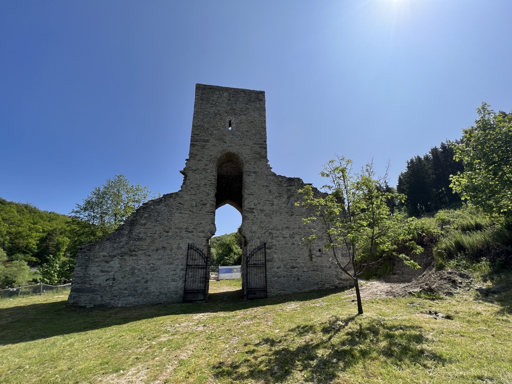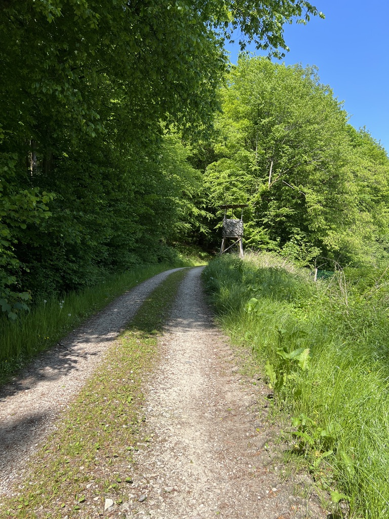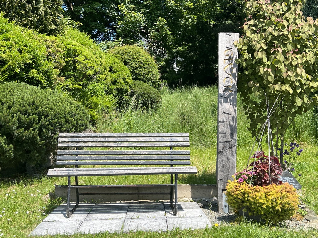Ich gehe wieder zurück vom Turm hinab durch das Tor, wandere durch den Ort und gehe auf der anderen Seite wieder den Berg hinauf. Am Friedhof vorbei stoße ich auf der linken Seite auf eine „Glücksbank“, das lädt mich natürlich sofort ein, kurz zu halten und den Ort ein wenig auf mich wirken zu lassen.