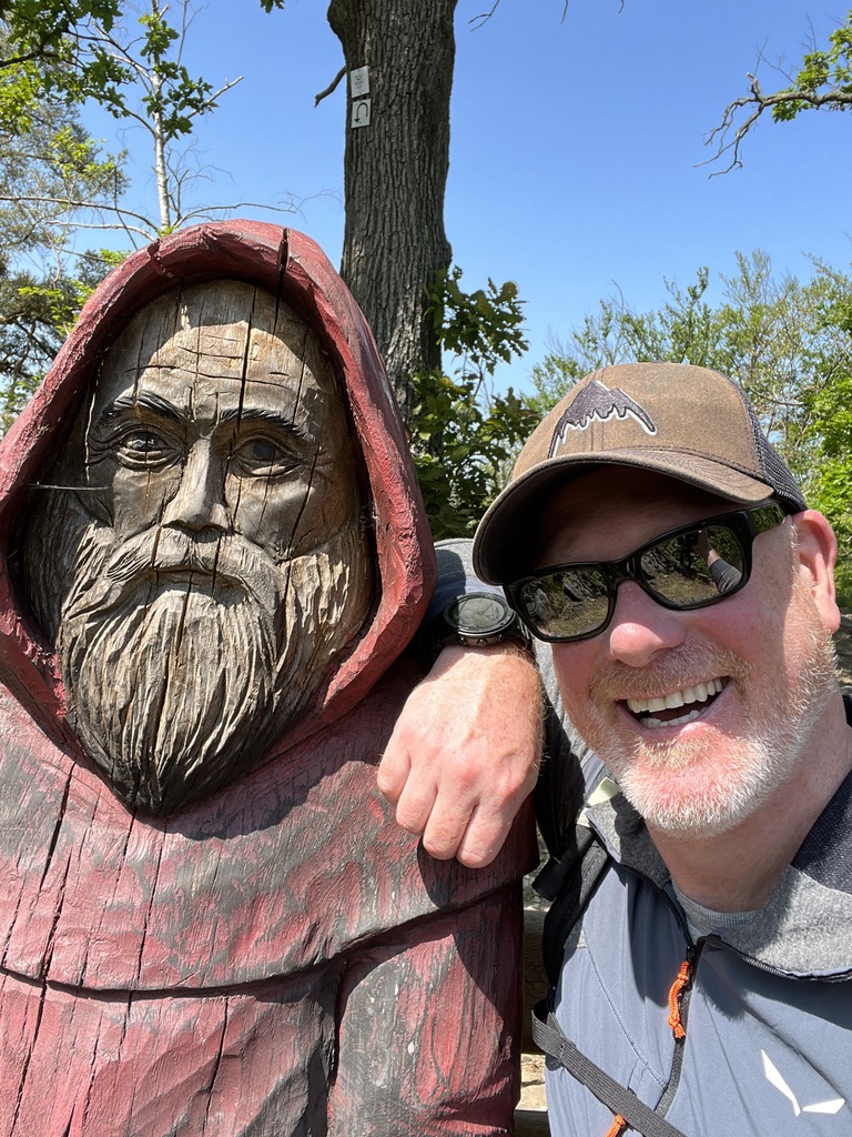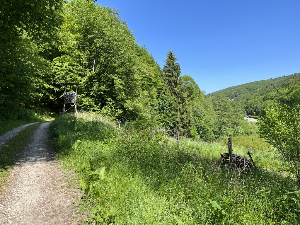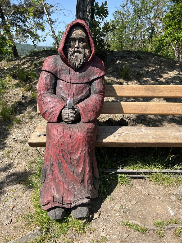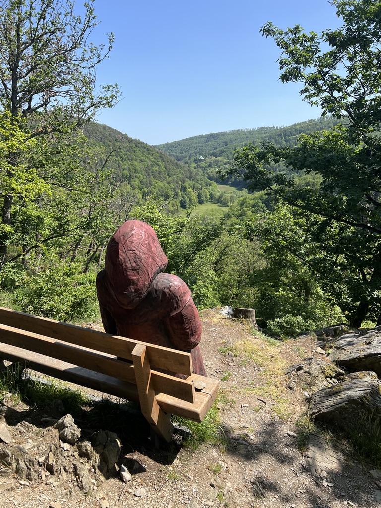 Von hier oben hat man einen wunderschönen Ausblick auf Altweilnau und in die südliche Richtung. Vorsicht beim „hochkommen“, denn dort oben sitzt ein hölzener Mönch auf einer Bank und blickt nach Süden, da kann man sich auch mal schnell erschrecken. Ich geniesse den Ausblick und entscheide mich dann die Tour mit dem Abstieg zu beenden.