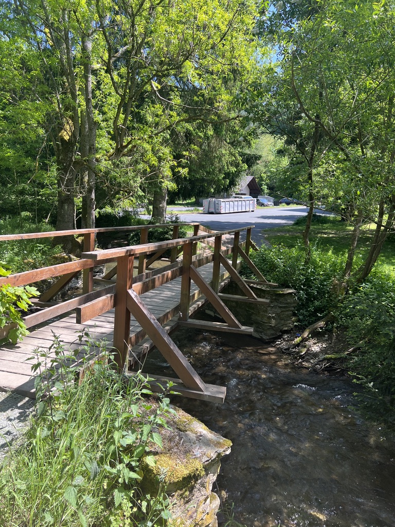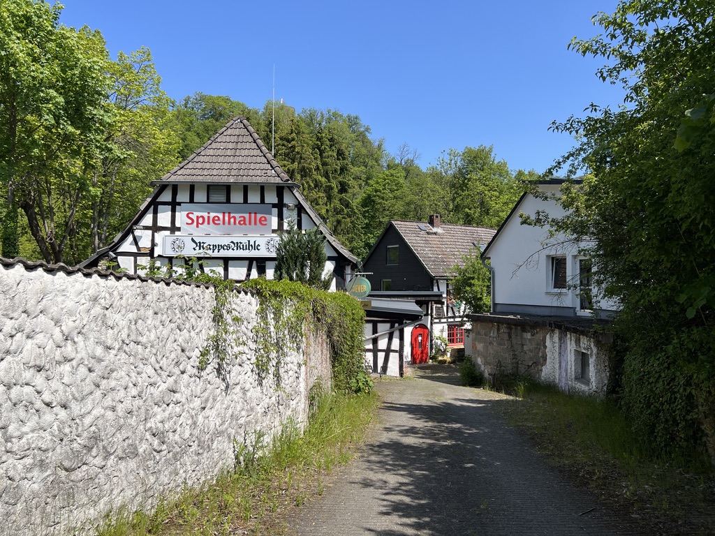 Hier gesellt man sich zu den Bikern, die hier Mittags Rast machen. Ich mache die Kurve, gehe an der Bundesstraße weiter entlang um dann hinter der Brücke, die Laufseite zu tauschen. Hier geht es rechts ab Richtung Mappes Mühle, ein Kaffee und ein Biergarten, wo man essen kann. Da es für mich noch sehr früh am Morgen ist, werde ich allerdings weiter auf dem Weiltalweg wandern, der links an der Mühle vorbeiführt.