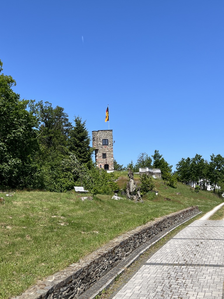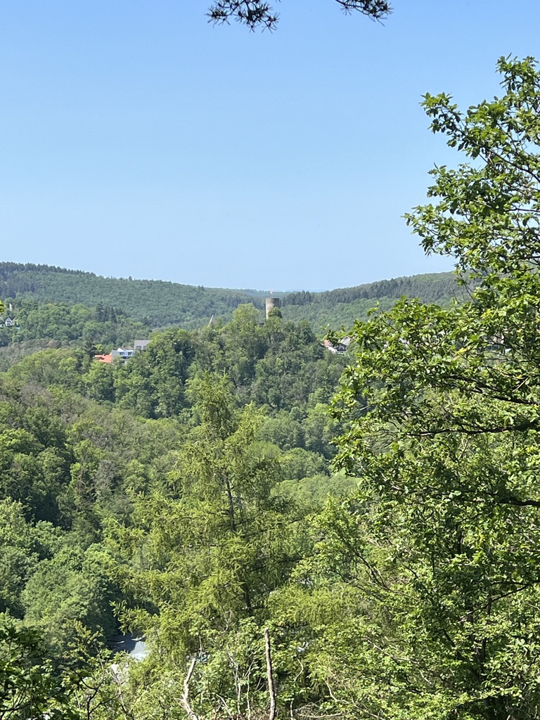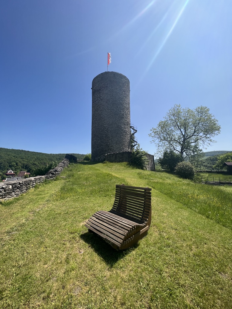 Im Verlaufe des Weges komme ich aus dem Wald heraus und blicke auf Neuweilnau. Der erste Blick fällt auf die kleine Kapelle, die gegenüber am Berg liegt. Ein süßes Gebäude und ich bin gespannt, ob ich dort noch hinkomme. Auf der linken Seite und auf den zweiten Blick erspähe ich einen Turm mit einer Fahne oben drauf.