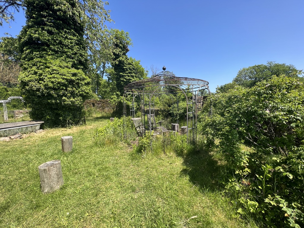Es geht in Serpentinen kontinuierlich bergauf, bis ich oben am Hessenforst Weilrod, dem Forstamt ankomme. Es handelt sich hier um das Schloss Neuweilnau, was oberhalb des Dorfes steht. Unterhalb des Forstamtes findet man eine hölzerne Tür, hier ist der Garten der Versuchung, man darf hier gerne einmal reinschauen. Von hier oben hat man einen tollen Blick auf das was draus und auch auf die Ebene unterhalb von Neuweilnau. Ein absolut geeigneter Rastplatz unterhalb des Forsthauses.