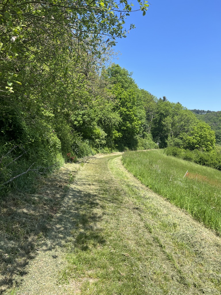 Hier werde ich noch vorbeikommen, aber leider kann man nicht näher an den Turm ran, da sich scheinbar um Privatbesitz handelt. Also geh ich weiter am Turm vorbei nach unten, an einem Grillplatz vorbei und biege dann, nachdem ich kurz nach oben gelaufen bin, an der Pferdekoppel rechts ab. Ab hier ist ein schöner bewachsener Grasweg, der mich wieder hinten an Neuweilnau vorbei führt.