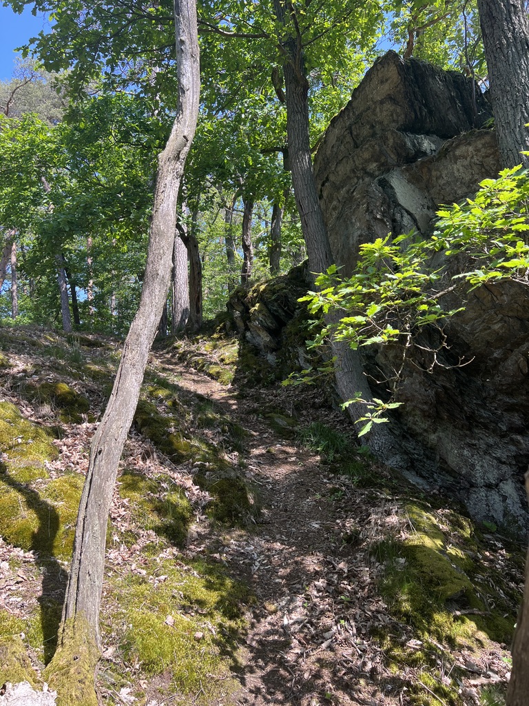 Folgt man hier den imaginären Pfad läuft man entlang der Felsformation immer weiter Richtung Altweilnau. Am Ende von diesem imaginären Pfad, kommt man an einer Holzbank heraus, geht dann rechts Richtung Zentrum des Ortes.