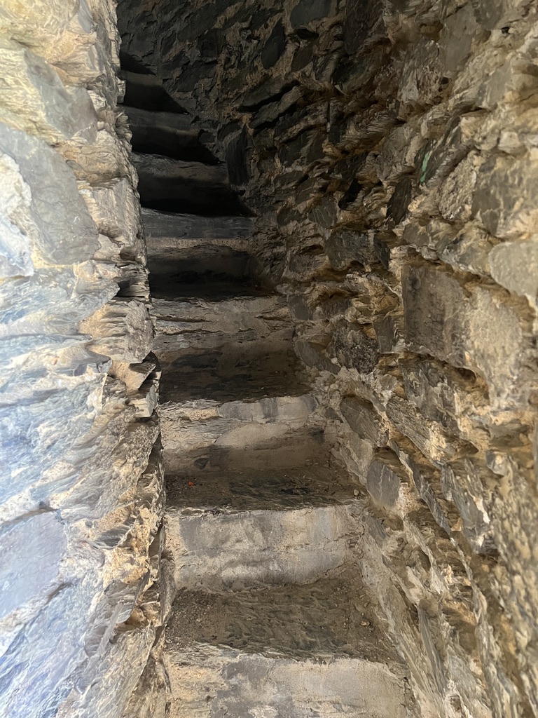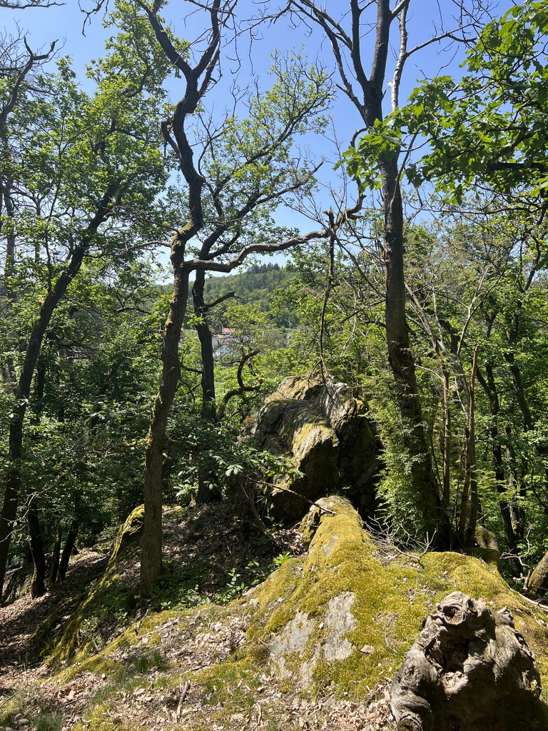 Ich überquere die Landstrasse und gehe ein wenig rechts gegenüber dem Hoteleingang den Berg hinauf. Es geht rechts ab, an der Kreuzung ein wenig in den Berg hinab, dann biege ich links steil nach oben ab. Ein fast nicht sichtbarer Pfad. Wenn man diesen erklommen hat, sieht man eine Felsformation, durch die ein paar Treppen hindurch führen. Dies ist das Hexetreppche.