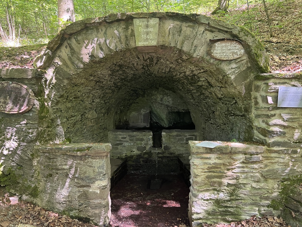 Nach der 🍀 Glücksbank 🍀 komme ich weiter oben wieder in den Wald hinein, hier scheint ein Friedwald zu sein, wo man sich beerdigen lassen kann. Ich mag diese Idee ja sehr gerne. Ich bin überhaupt kein Friedhofstyp, will dort auch nicht beigesetzt werden … ein Friedwald is schon was schönes … daher laufe mit Demut den Weg entlang durch den Friedwald. Im Friedwald komme ich an dem Bayrhoffer Brunnen vorbei und laufe dann weiter im Friedwald.