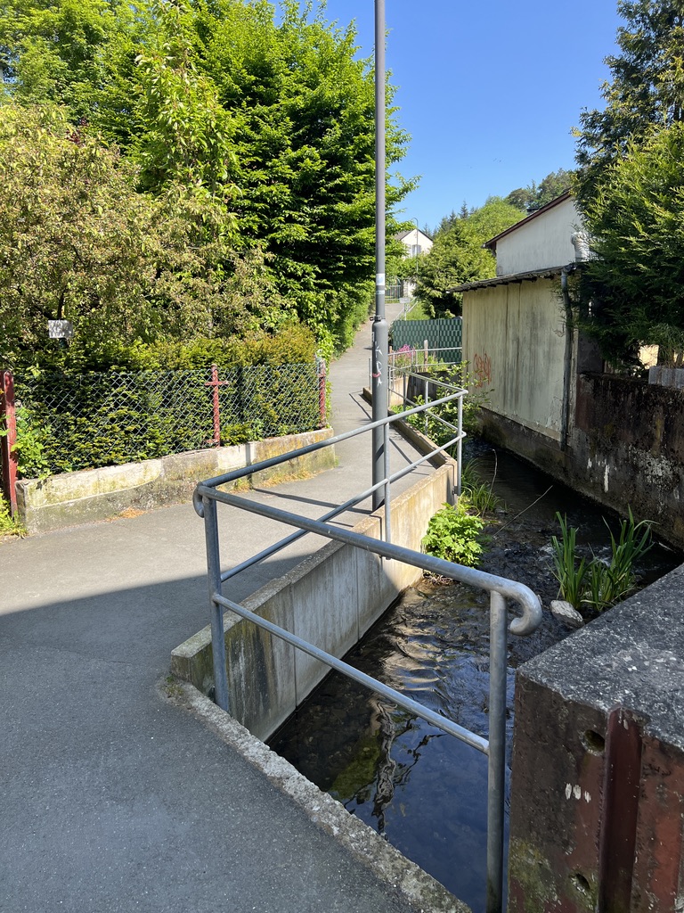 Ich fahre nach Schmitten im Taunus, um dort eine 12 km lange Wanderung zu begehen, die Himmelsleiter im Taunus. Mein Auto parke ich sicher am Freibad auf dem öffentlichen Parkplatz (kostenfrei) und laufe dann Richtung Rossmann/Rewe Markt in das Zentrum, wo die Wanderung für mich beginnt. In einer kleinen Seitenstraße der Hauptstraße, der Wenzelstraße, startet meine Wanderung an einem Bachlauf.