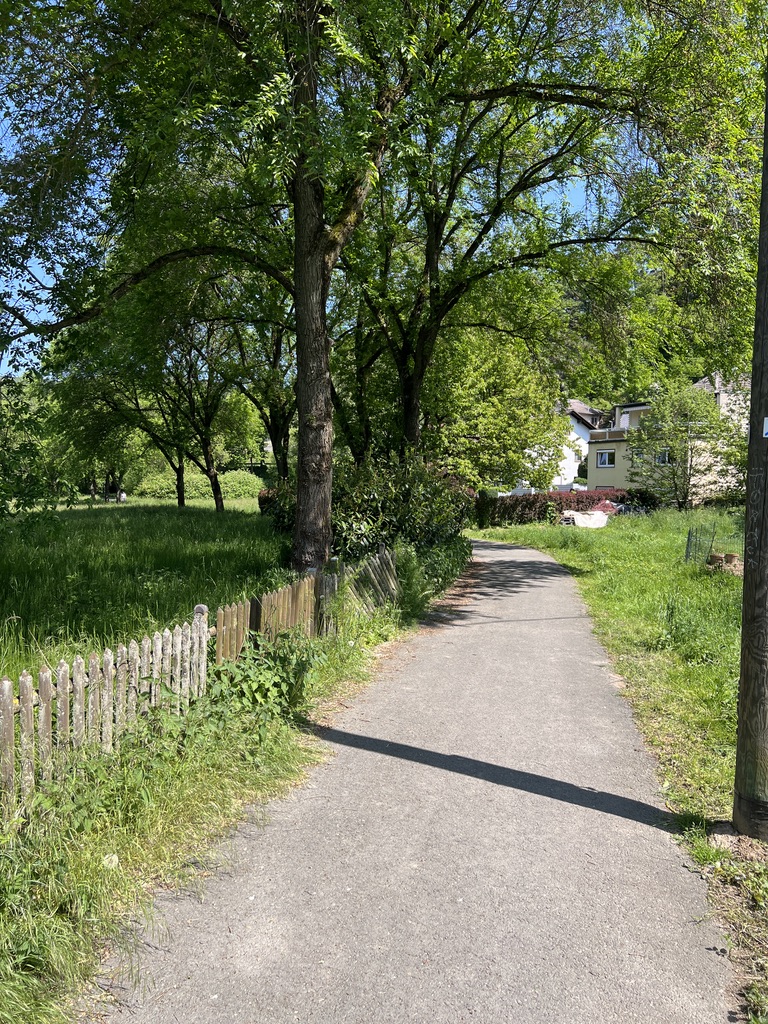 Zuerst geht es durch ein Wohngebiet den Berg hinauf, dann geht es nach einem mächtigen Anwesen links ab auf einen kleinen Feldweg.