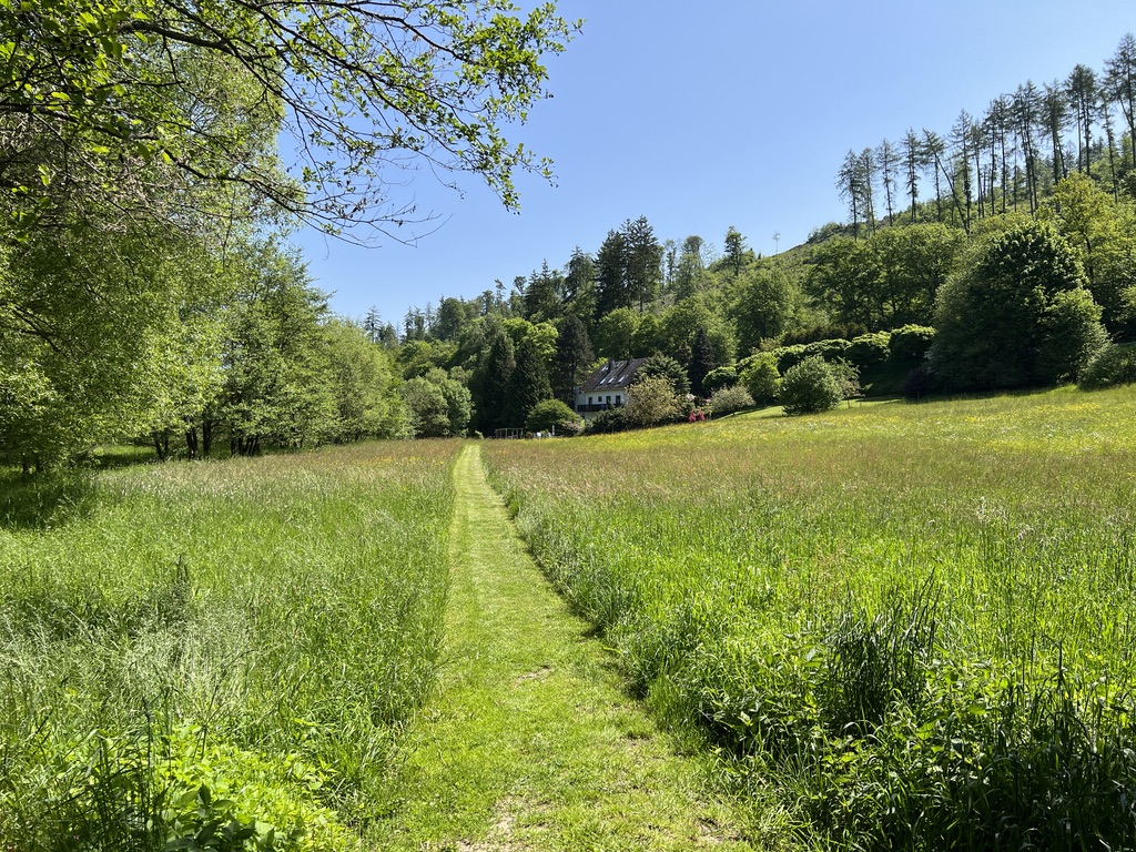 Auf der linken Seite steht ein wunderschönes kleines Ferienhäuschen, mit einem traumhaften Blick ins Tal. Kurz hinter diesem Ferienhaus, geht es rechts den Berg hinauf. Steil geht der Weg nach oben, ein kleiner Pfad den ich hinauf stampfe.