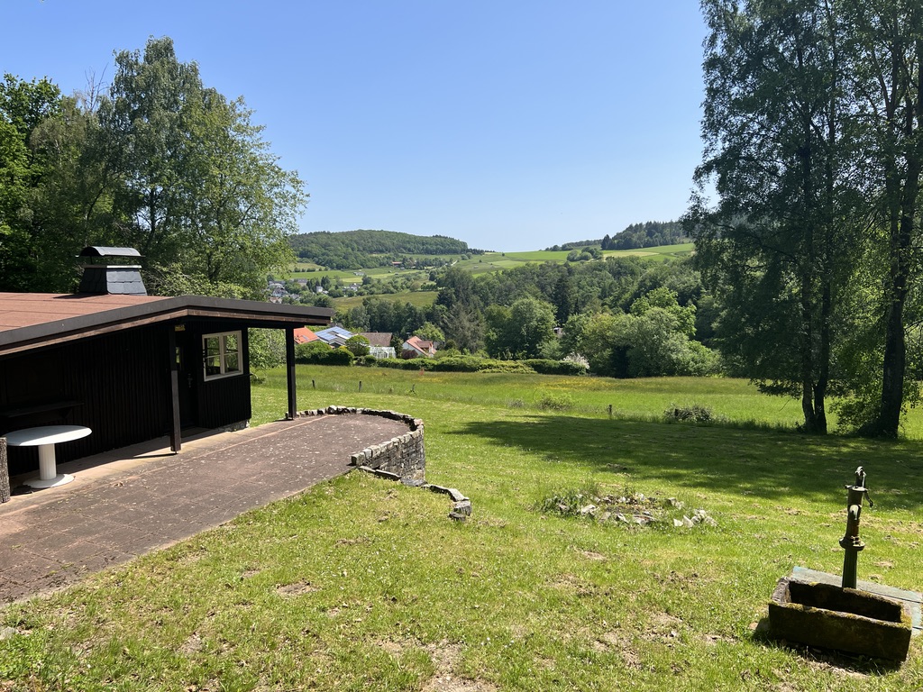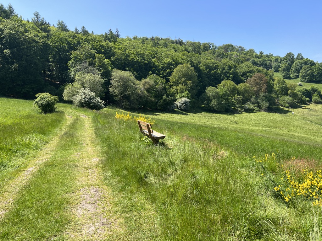 Der Waldweg endet an einem Wanderparkplatz, hier geht ihr Weg links steil nach oben und oben angekommen, findet man eine wunderschöne Bank, auf der man in das Tal und die Schafeweide unterhalb schaut. Links oberhalb des Tals blickt man auf das Örtchen Treisberg.