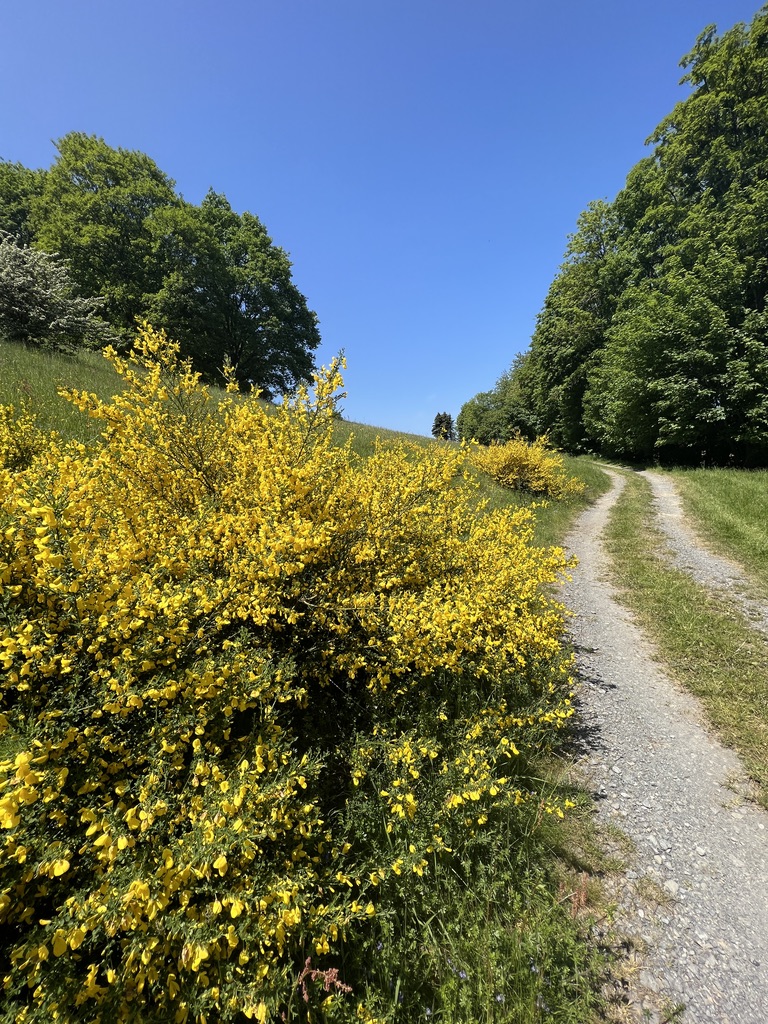 An einer der gerodeten Stelle hat sich der Ginster massiv ausgebreitet, hier entscheide ich mich auf einer kleinen Bank noch einmal den tollen Ginstergeruch zu geniessen, sonne mich und trinke meine Wasserflasche leer.