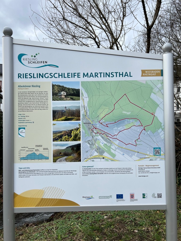 Von Wiesbaden fahre ich nach Eltville Martinsthal, wo ich auf dem Parkplatz an der Feuerwehr mein Auto abstellen kann. Von hier aus startet der circa 8 km lange Rundweg durch die Weinberge von Martinsthal. Der Name der Rieslingschleife „Alleskönner Riesling“ – ok dann lass uns mal sehen.