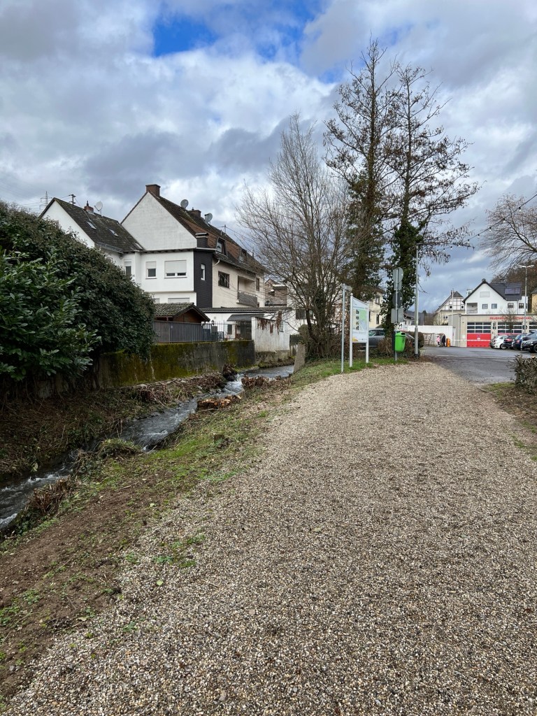 Ich laufe gen Süden, Richtung Eltville, am Wallufbach entlang, wenig später biegt der Weg nach links ab, und ich gehe hinauf zur Bundesstraße, die ich an der Bushaltestelle „am Steinberg“ überquere. Von hier aus gehe ich durch das Wohngebiet, welches direkt an die Weinberge anschließt.