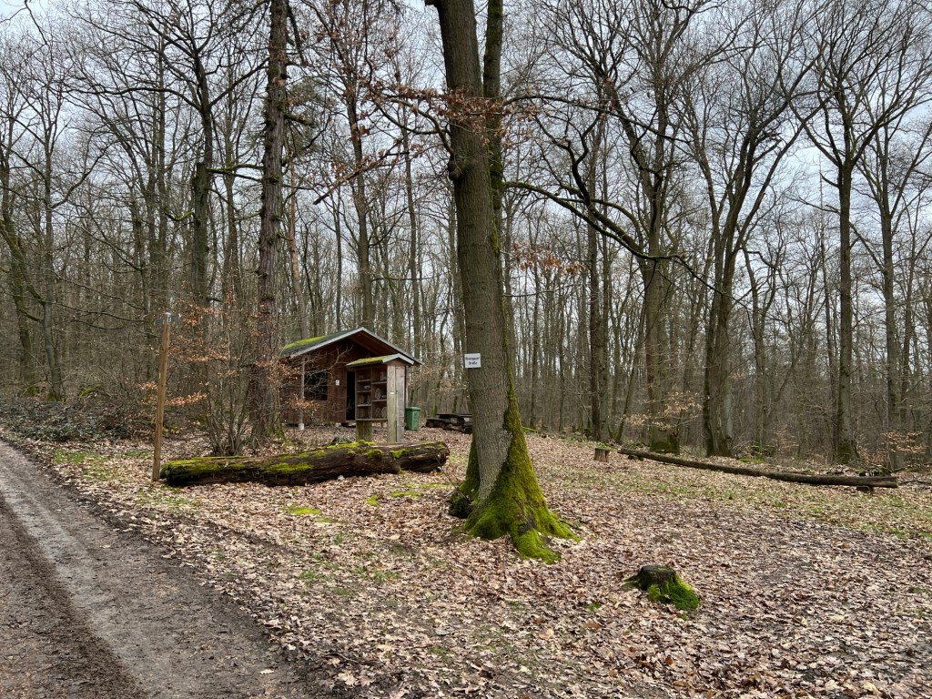 Nachdem ich einen sehr matschigen Forstweg hinunter gelaufen bin, komme ich weiter in den Wald hinein und sehe auf der rechten Seite die ersten Hütten stehen. Hier geht der Weg weiter geradeaus, leicht abschüssig und ich frage mich, ob ich überhaupt noch zum Weinberghäuschen Diefenhardt komme oder ob ich bereits in Martinsthal wieder rauskomme.