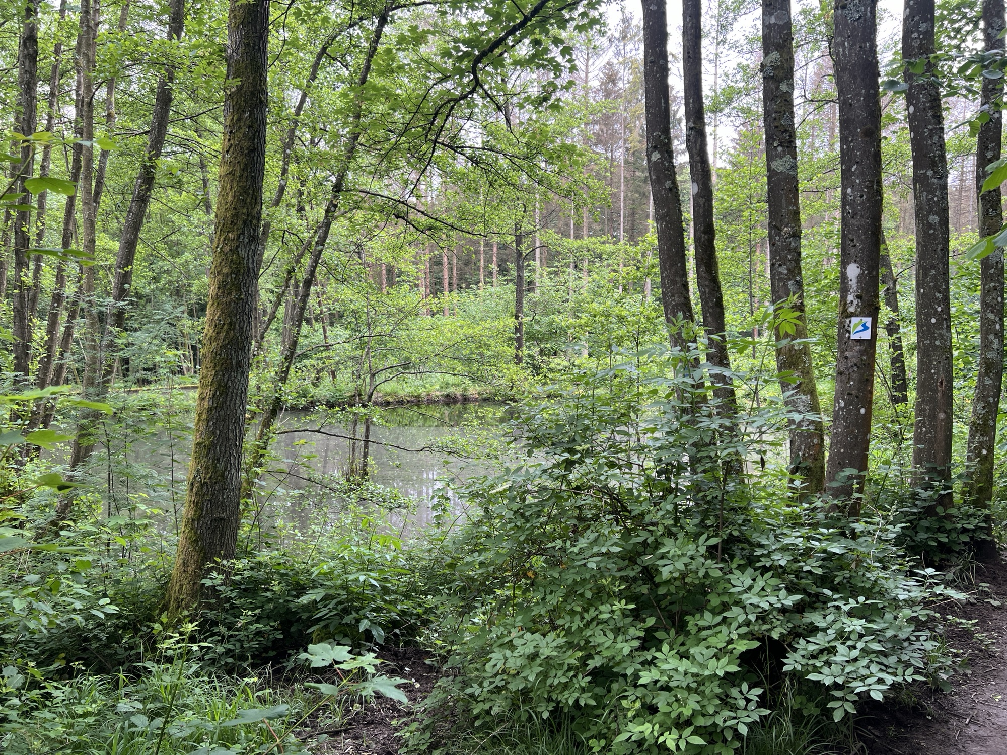 Unterhalb des Forsthauses geht der Pfad steil über eine Wiese nach unten, ich komme an zwei Fischteichen heraus und biege hier dann wieder rechts auf einen breiten Forstweg ab, dem ich eine ganze Zeit lang folge.